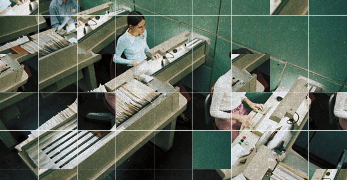 The Transorma multi-position letter sorting machine measured 13 ft excessive and was cut up throughout two ranges. It carried mail on a conveyor belt from its decrease degree to a gaggle of 5 postal employees on the higher degree. The clerks would then use a keyboard to enter details about their vacation spot. Based mostly on the inputted data, the machine would then transport letters to completely different trays and drop them into chutes that introduced them again to the decrease degree. However as the quantity of mail elevated within the years after World Warfare II — going from 33 billion pieces of mail per 12 months to 66.5 billion between 1943 and 1962 — the USPS wanted a option to sustain.